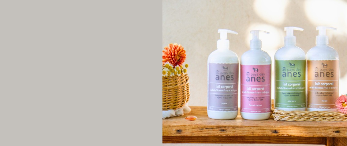 Nos produits cosmétiques proposés sont enrichis avec 10% de lait d'ânesse frais et biologique.