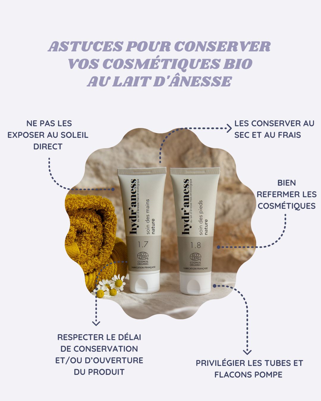 Selon le type de cosmétique naturel et les marques, une date de péremption est indiquée ou non en plus d’une date de conservation après ouverture. Pour éviter toute réaction allergique, il est bien sûr conseillé de respecter le délai d’ouverture d’un cosmétique. Quant à la conservation, cela dépend bien évidemment des produits, de la composition et des marques. Pour ce qui est des cosmétiques au lait d’ânesse des marques Hydr’aness et Au Pays des Ânes, il est recommandé de les conserver sur une durée de 2 ans maximum. Après ouverture, cela varie entre 6 mois et 1 an selon les produits.