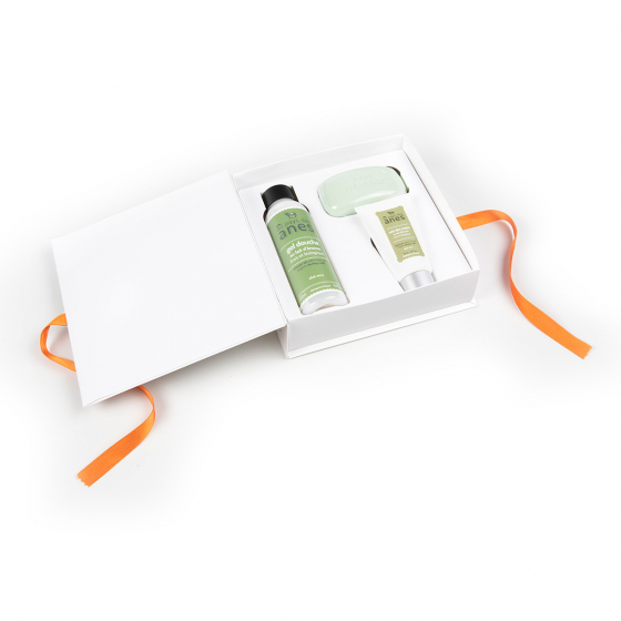 Dans un packaging original, en forme de livre, vous retrouvez un gel douche (250ml), un savon concave (125 g), et une crème pour les mains en format tube pour plus de praticité (75 ml). Un assortiment de qualité qui nourrit la peau en profondeur, et possède des propriétés régénérantes incroyables. C’est un vrai soin plaisir, avec des cosmétiques naturels qui peuvent convenir aux peaux les plus sensibles.