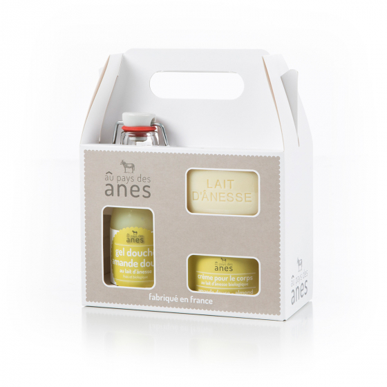 Les trois produits de ce coffret sont enrichis au lait d’ânesse frais et biologique : le gel douche limonade (100 ml), la crème pour le corps (pot 200 ml), et le savon concave (125 g). Un ingrédient miraculeux associé à l’amande douce pour une hydratation optimale de votre peau dont les inflammations ou irritations sont immédiatement apaisées. Des formules naturelles aux propriétés variées qui vous permettent de renouer avec une peau douce et souple au quotidien.