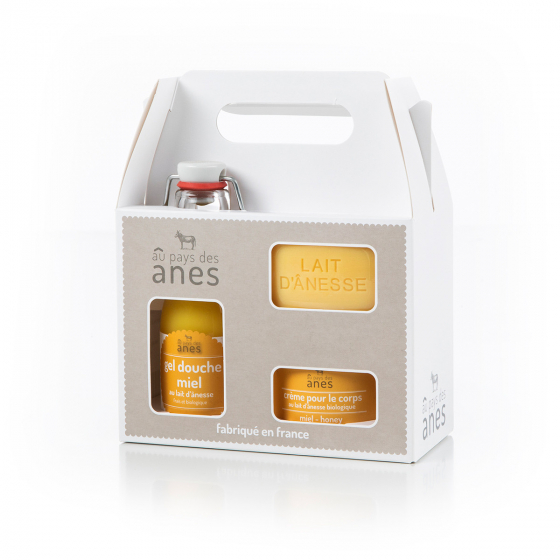 Composé d’un savon concave (125 g), d’un gel douche limonade (100 ml), et d’une crème pour le corps (pot 200 ml), ce coffret s’intègre en toute simplicité dans votre routine beauté et sublime votre peau au quotidien. En effet, ces trois produits sont enrichis au lait d’ânesse frais et biologique et vous font ainsi bénéficier de propriétés hydratantes et régénérantes ancestrales. Le miel, quant à lui, favorise les cicatrisations et possède une action détoxifiante extraordinaire.
