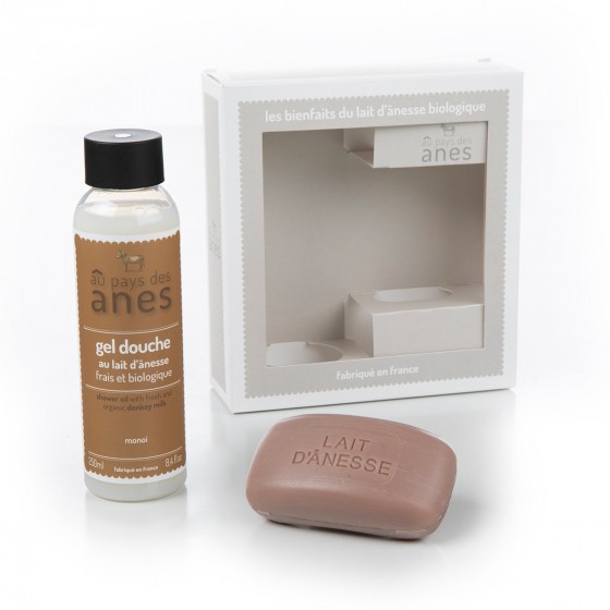 Avec un gel douche (250 ml) et un savon concave (125 g) enrichis au lait d’ânesse frais et biologique, vous bénéficiez de cosmétiques aux propriétés hydratantes et nourrissantes remarquables. Votre peau est régénérée et reste souple en profitant de nombreux éléments nutritifs. Le parfum enivrant du monoï, quant à lui, vous transporte en été tout au long de la journée pour un soin des plus réjouissants.