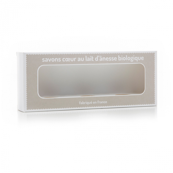 <p>Notre savon cœur Nature, "Fleur de Coton" contient 10% de lait d’ânesse biologique et est enrichi avec du beurre de Karité</p>