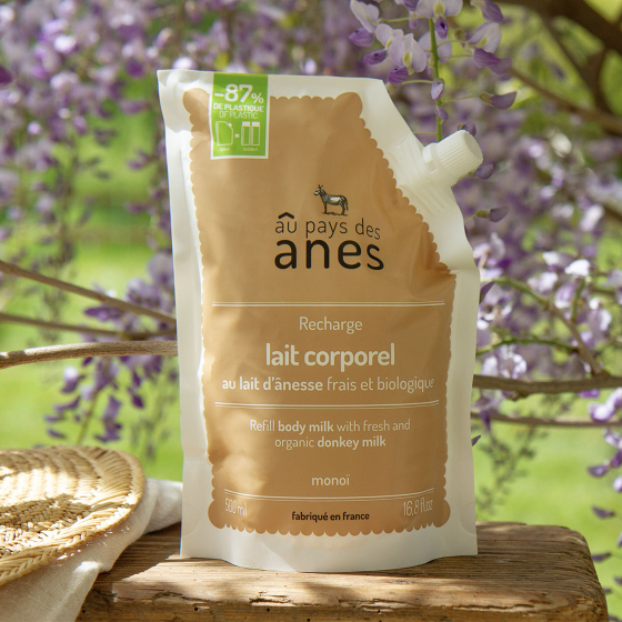Recharge lait corporel au lait d'ânesse frais et biologique Monoï 500ml