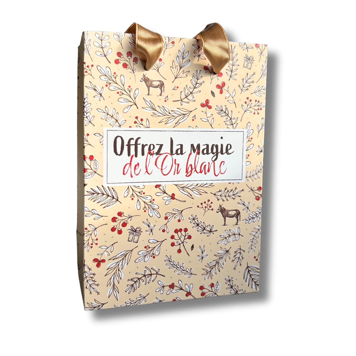 Offrez un cadeau qui vous ressemble grâce à notre sac boîte cadeau Au Pays des Ânes ! Avec ses dimensions de 15 x 8 x 21 cm, ce joli sac à la forme de boîte combine élégance, praticité et authenticité. Sa conception solide permet d’y glisser facilement vos savons et cosmétiques au lait d'ânesse favoris.