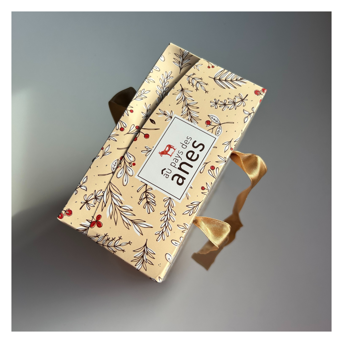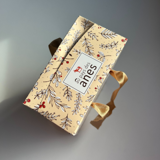 Imaginé dans l’esprit chaleureux de la marque Au Pays des Ânes et avec une attention portée aux détails, ce sac boîte met en avant un emballage réutilisable. Son design soigné en fait un écrin idéal pour vos cadeaux personnalisés, tout en valorisant la beauté naturelle des produits que vous y glisserez.